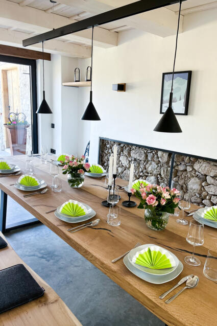 Mittelpunkt des Bauernhaus-Chalet ist die ehemalige Scheune - jetzt ein großzügiger Wohnraum auf zwei Etagen - das zum Verweilen und kochen mit Deinen Lieben einlädt. Im Erdgeschoss befindet sich die vollausgestattete Küche. Ob ihr nun ein einfaches Frühstück oder ein opulentes Abendessen zubereiten möchtet, die Küche bietet euch alles, was ihr braucht. Der große Tisch hat genügend Platz für eine gesellige Runde - hier könnt ihr zusammen essen, lachen und gemeinsam Zeit verbringen.